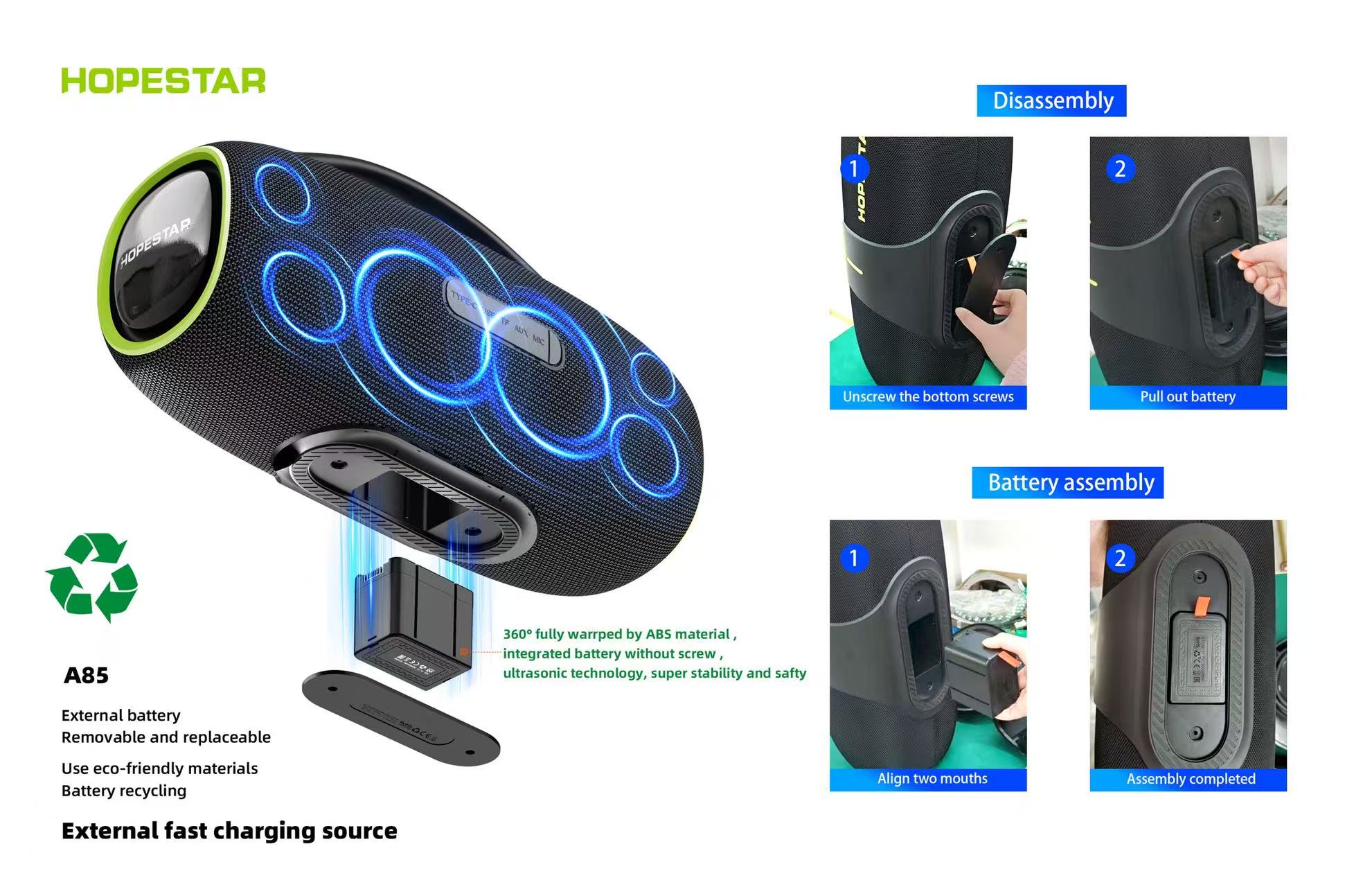 El HOPESTAR A85 es un altavoz portátil de alta gama que combina una potencia excepcional con una calidad de sonido superior. Diseñado para los amantes de la música que exigen rendimiento y durabilidad, es ideal para fiestas, eventos al aire libre y uso profesional. Su resistencia al agua y su batería de larga duración lo convierten en un compañero confiable en cualquier situación.