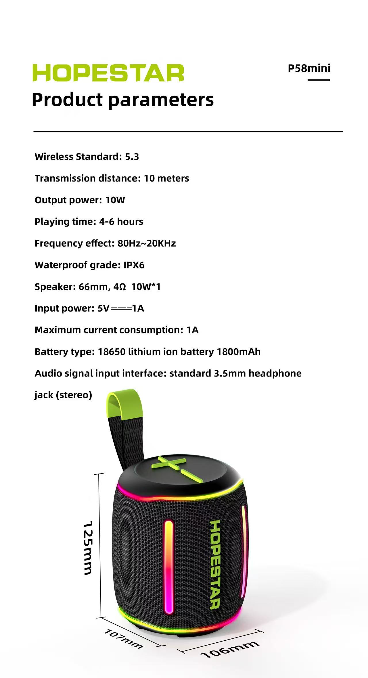 Descripción General: El HOPESTAR P58mini es un altavoz portátil ultracompacto que prioriza la máxima portabilidad y resistencia. Con su pequeño tamaño, alta protección contra el agua (IPX6) y un sonido claro, es el compañero perfecto para llevar música a la ducha, a la piscina, de senderismo o para disfrutar de audio personal en cualquier lugar de forma práctica y sin preocupaciones.